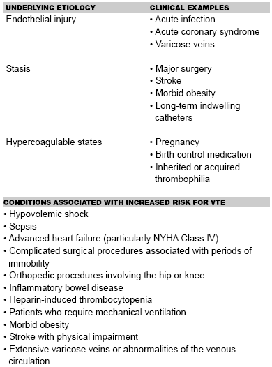 The development of venous thrombosis is encouraged by situations where flow within the venous circulation is mechanically impeded or fluctuates widely during periods of hemodynamic instability. Shock is associated with diminished venous flow whether caused by massive bleeding, severe burns, or cardiac compromise. These situations increase the risk for thrombosis in the venous system. Prolonged periods of immobility following an orthopedic procedure, major trauma, disabling stroke, exacerbation of an arthritic condition, disabling heart failure, or damage to veins (varicosities) are associated with increased risk for VTE.7 Some patients with heart failure, inflammatory bowel disease, or cancer may have a combination of diminished venous flow and immobility increasing their risk for VTE. Some patients have an increased propensity to venous thrombosis because of congenital thrombophilia or an acquired (most often drug-induced) disturbance of normal clotting mechanisms in the body. In some instances it is appropriate to initiate anticoagulation in the ED when certain sedentary patients with complex medical conditions are transported to the ED for treatment of acute exacerbations of the chronic conditions. (See Insert.)