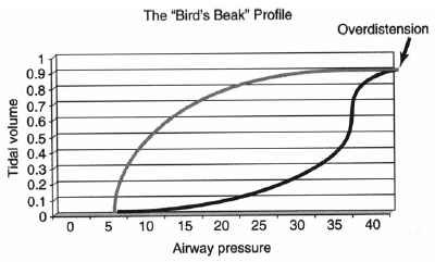 Alveolar overdistention is reflected in this pressure-volume curve in which there is an increase in airway pressure at the end of inspiration without any concomitant increase in tidal volume. This pressure-volume curve pattern approximates a "bird's beak" profile, which is a reasonable indicator of airway injury. (Used with permission from Roberts JR, Hedges JR, eds. Clinical Procedures in Emergency Medicine. 4th edition. Philadelphia: Elsevier Inc.; 2004: 146-170.) |