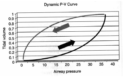 Compare this curve to that in Figure 1: Note that the lower segment of this loop (denoting inspiration) is initially flat along the X-axis, indicating that there is inadequate PEEP to keep smaller airways open. Once the airway pressure is high enough to open the alveolar units, then each increase in airway pressure is matched by a corresponding increase in tidal volume. (Used with permission Roberts JR, Hedges JR, eds. Clinical Procedures in Emergency Medicine. 4th edition. Philadelphia: Elsevier Inc.;2004:146-170.) |