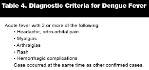 The WHO has listed clinical criteria that support the diagnosis of dengue fever. (See Table 4.) WHO dengue hemorrhagic fever criteria include: recent history of fever, hemorrhagic complications, thrombocytopenia and hematocrit > 20% average for patient's sex, age and population.