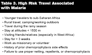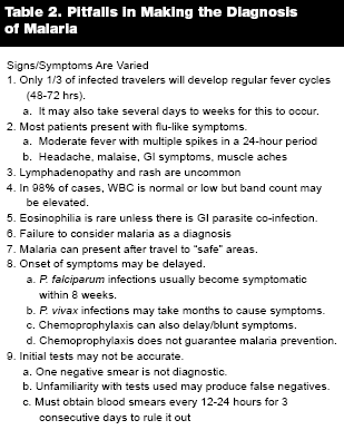 Diagnosis. One must maintain a high degree of suspicion in patients with a history of travel to an endemic area and any history of fever. Cases of "runway malaria" exist where it is suspected that an infected mosquito has been transported by airplane and may cause disease when released at the destination airport.15 Thus, any international traveler ill enough to require admission may require screening as well. Table 2 summarizes some of the pitfalls in making the diagnosis. While most patients become ill in the first month, some may take months (even years) to present. Table 3 summarizes high-risk travel that is associated with malaria.