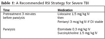 ETI can lead to an elevation in ICP by a reflex sympathetic response to laryngoscopy and a cough reflex from airway manipulation.5 There are no ideal studies evaluating the effectiveness of empiric lidocaine to blunt the aforementioned reflexes, to minimize elevations in ICP, or to improve neurologic outcomes in head-injured patients. There are, however, numerous studies that suggest a benefit. Lidocaine prior to ETI has been associated with a significant reduction in catecholamine release.6 Two studies have shown that lidocaine has a positive impact on ICP during suctioning by blunting the cough reflex, and one small study evaluated ICP during elective intubations for brain surgery and concluded that lidocaine reduced the ICP by 12 mmHg.7-9 There is little evidence that lidocaine causes harm and, as such, it should be administered as a pretreatment before RSI.5 Administration should be at least 3 minutes prior to laryngoscopy at a dose in 1.5 mg/kg IV with a maximum dose of 100 mg.10 Fentanyl has been shown to diminish the rises in heart rate and blood pressure associated with laryngoscopy and intubation. Its use should be considered at a dose of 3 mcg/kg IV.11,12 Defasciculating doses of nondepolarizing neuromuscular blocking agents (e.g. vecuronium 0.01 mg/kg or rocuronium 0.06 mg/kg) prior to administration of succinylcholine blunt fasciculation-induced increases in ICP. These agents have been shown to be effective in the neurosurgical population but have not been evaluated in TBI patients.13