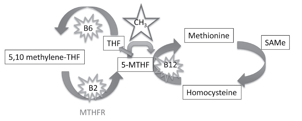 The MTHFR (methylenetetrahydrofolate reductase) enzyme converts 5,10 methylenetetrahydrofolate (5,10 methylene-THF) into 5-methyltetrahydrofolate (5-MTHF), which requires B2 (riboflavin) as a cofactor. 5-MTHF donates a methyl group in the reaction converting homocysteine to methionine, which requires B12 as a cofactor. B6 (pyridoxine) is required in the conversion of tetrahydrofolate (THF). |