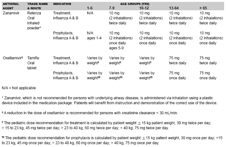 The first table below shows the trade name, route of administration, indications, and recommended daily dosage of the two currently recommended influenza antiviral medications. The second table below shows the precautions and toxicities for these neuraminidase inhibitors.