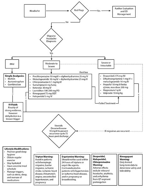 When a patient with a self-identified migraine presents to the ED, the EP is tasked with sorting through the history to ensure that the diagnosis is correct, to reasonably exclude other causes of an acute headache, initiate treatment, assess the response, and make an appropriate disposition for the patient, with referral to primary care or specialists as needed. This article will focus on the acute treatment of migraines in the ED.