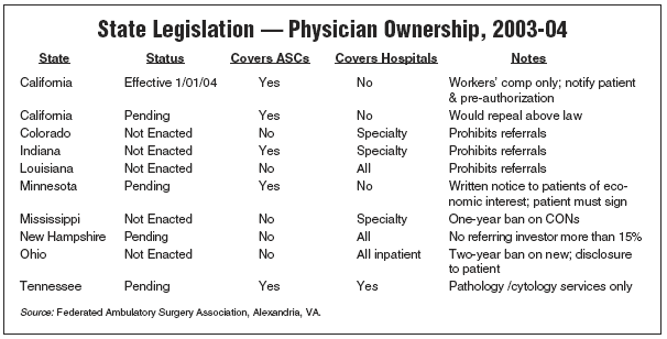 "In terms of what AHA has been doing, our legislative agenda in that respect has been focused on the specialty hospitals," says Ellen Pryga, director of policy. However, AHA has brought together state hospital associations to discuss issues that are common, including a meeting on specialty hospitals in fall 2003. She says that ASCs were discussed briefly.