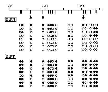 Ms-SNuPE analysis of TPEF hypermethylation in uncultured bladder and colon tumor tissues and adjacent normal tissues obtained from cancer patients (see Figure 2, right panel) showed that 11 of 16 bladder tumor tissue samples and three of four colon tumors were hypermethylated in the 5’ region of TPEF compared to the normal adjacent samples. Thus, 14 of 20 tumor samples showed TPEF hypermethylation, clearly demonstrating that TPEF hypermethylation is evident in tumors. Ms-SNuPE analysis, however, provides the average percent of methylation of a large number of individual molecules. To determine the TPEF methylation levels and patterns in individual molecules, the TPEF gene from a bladder cancer patient was cloned and colonies identified and sequenced. The sequencing analysis (see Figure 3) showed some TPEF methylation normally, with a significant increase of methylation in the tumor tissues. This suggests that TPEF methylation changes may be initiated in the pre-malignant tissues and accentuated in the tumor tissues.