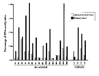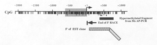 Alterations in dna methylation patterns are a hallmark of human cancers. DNA methylation is prevalent at the C-5 position of cytosine in CpG dinucleotides.1 CpG sequences, although reduced in the genome due to an increase in the rate of spontaneous deamination of 5-methylcytosine over cytosine, usually are seen clustered in CpG islands.2 These are regions of greater than 200 bp DNA that have a G+C content greater than 0.5, and an observed/expected level of CpG greater than 0.6.3 CpG islands usually are found at the 5’ regions of genes, and extend from upstream of the transcripition initiation site into the exonic coding regions.4 CpG sequences within CpG islands are predominantly free of methylation, whereas CpG sequences outside of CpG islands show a high degree of methylation in somatic cells.2