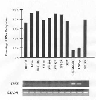 tissues, with a robust expression in prostate and brain and low levels of expression in other tissues. TPEF was localized to chromosome 2q33 by fluorescence in situ hybridization. Methylation levels of the 5’ region of TPEF also were measured using the Methylation-