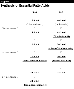 Among the four families of PUFAs (n-9, n-7, n-6, n-3; so termed because of the position of the first double bond from the methyl end of the molecules), the n-6 and n-3 (also called omega-6 and omega-3) are essential fatty acids that cannot be synthesized by humans and therefore, must be obtained from the diet. In Western diets the 18-carbon linoleic acid (c18:2, n-6) is the most abundant n-6 PUFA. Vegetable oils (e.g., sunflower, safflower, and corn oil) are particularly rich sources of n-6 PUFAs. In contrast, the most common n-3 PUFAs in the human diet are a-linolenic acid (aLA; c18:3, n-3; found in canola and soybean oils, some nuts, and flaxseed), and eicosapentaenoic acid (EPA) and docosahexaenoic acid (DHA) (both found in high levels in cold water fish such as mackerel, menhaden, salmon, and tuna). In addition, aLA also can be desaturated and elongated to form EPA (20:5, n-3) and DHA (22:6, n-3) in the body (see Figure 1).