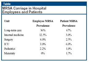 Synopsis: A total of 6.2% of hospital employees were nasal carriers of MRSA, with the rate highest among workers in long-term care (36%). In 4 of 10 families surveyed, family members were colonized by the same MRSA as the employee.