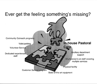 "The idea isn’t to push religion, but to meet spiritual needs," says Rehak. To make sure that everyone understood the difference, there were training sessions and written information reinforcing the idea. "Nothing will turn people off more than someone trying to jam religion down their throat," says Ringler. "And while we are mostly white and Christian down here, there are others. We have a lot of retirement communities and are a summer recreational area. There are increasing numbers of Asians, Hispanics, African-Americans, and Jews. We have to meet all the needs."