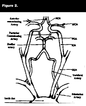 Thrombotic strokes occur as a result of in-situ clot formation, usually superimposed on atherosclerotic disease. Atherothrombotic infarcts are associated with plaques of the carotid arteries, the vertebrobasilar arteries, or the middle cerebral artery. Common areas for thrombotic occlusion are cerebral vessel branch points, as thrombosis is usually the result of clot formation that develops in the area of an ulcerated atherosclerotic plaque that occurs in an area of turbulent blood flow (see Figure 2). Patients at particularly high risk for intracranial thrombosis are patients with diabetes or of African-American descent.