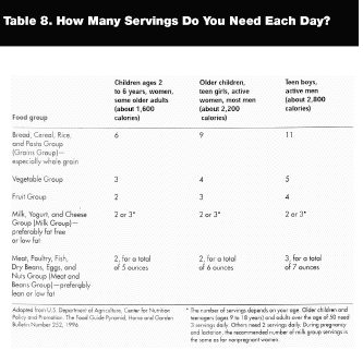 At follow-up visits, the PCP can use simple educational messages to underscore the importance of the lifestyle changes the child and his/her family are trying to implement. A good source for helpful advice is Dietary Guidelines for Americans, 2000,2 and a sample message from that resource is shown in Table 6. The USDA Food Guide Pyramid serves as another basic teaching tool. (See Table 7.) Number of servings needed from each food group varies according to age, gender, size, and physical activity level, but general guidelines are provided. (See Table 8.)