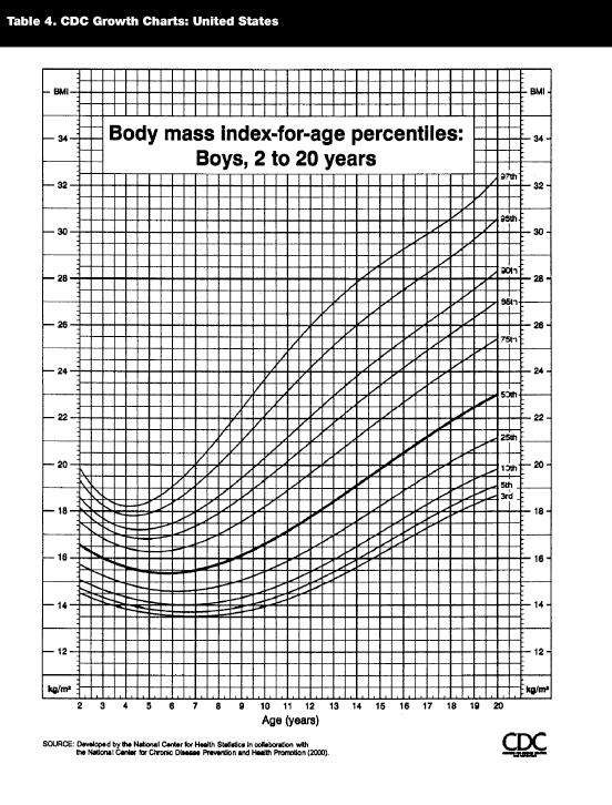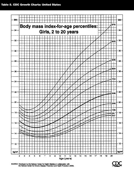 As with adults, measuring and recording height and weight are important components of a weight management program for children. CDC growth charts for boys and girls ages 2-20 allow providers to plot BMI for age and follow changes across maturation. (See Tables 4 and 5.)