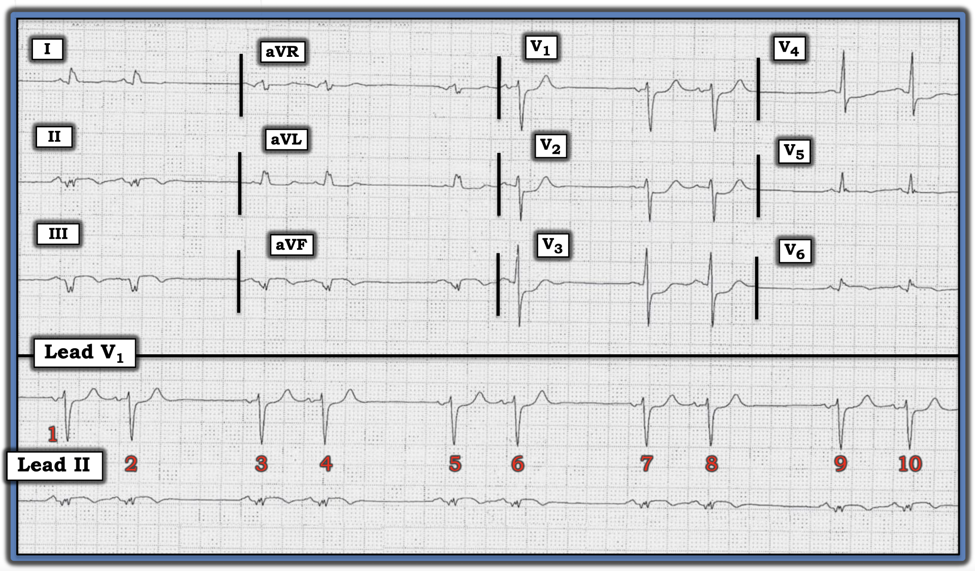 • The underlying rhythm is sinus, as determined by the presence of an upright P wave with a constant PR interval in the long lead II rhythm strip.