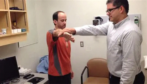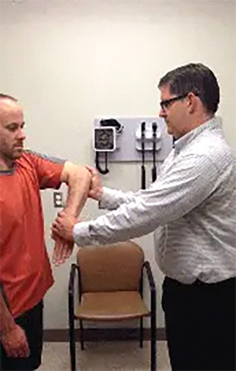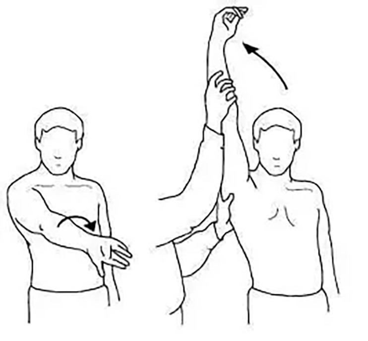 Neer test involves passively flexing the patient’s arm overhead while the arm is internally rotated. Pain during this motion suggests irritation or impingement of the rotator cuff tendons against the anterior acromion.10-12 (See Figure 4.)