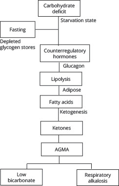 The absence of insulin results in glucagon-induced lipolysis of triglycerides to produce free fatty acids. These undergo beta oxidation and ketogenesis to become the ketone bodies acetoacetic acid and beta hydroxybutyric acid, which serve as an energy source in starved states.21 However, as their names suggest, they have a low pH and cause the elevated anion gap metabolic acidosis. To maintain physiologic pH, the body uses the bicarbonate buffering system (CO2 + H2O D H2CO3 D HCO3- + H+), accounting for the low bicarbonate levels seen. However, in DKA, this mechanism cannot fully compensate, and often patients are noted to be hyperventilating to blow off CO2, ultimately countering the metabolic acidosis with a respiratory alkalosis.
