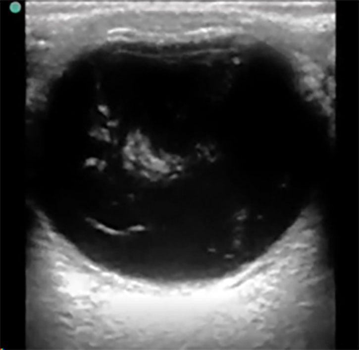Ocular point-of-care ultrasound (POCUS), or B-scan, showing swirling hyperdense echogenic densities seen in vitreous hemorrhage Courtesy of Jodi Jones, MD |