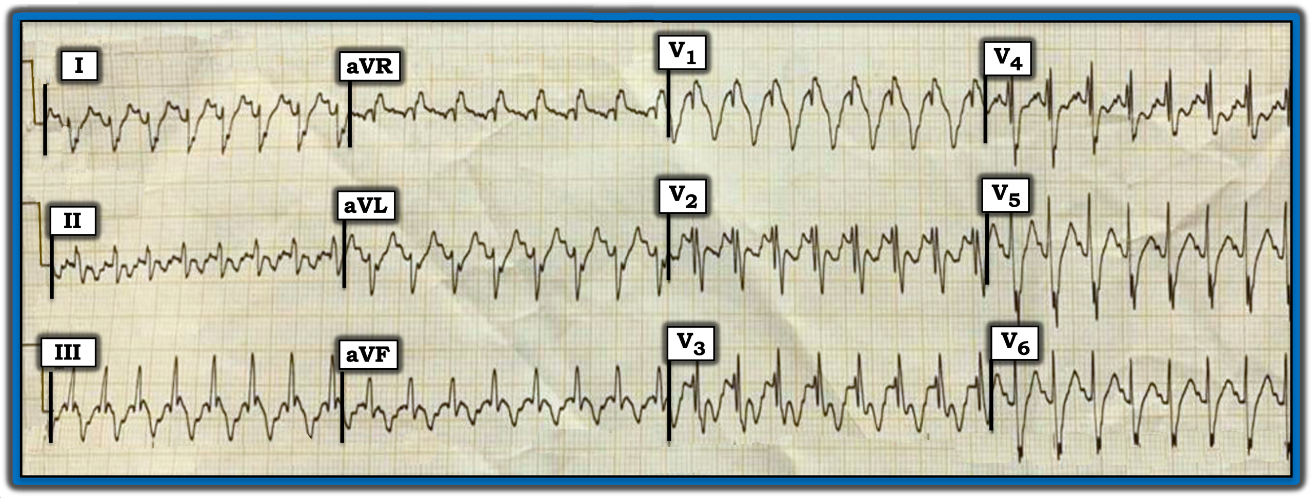 Interpretation: The 12-lead ECG in the figure shows a regular wide-complex tachycardia (WCT) at a rate of ~190 beats/minute without clear sign of sinus P waves.