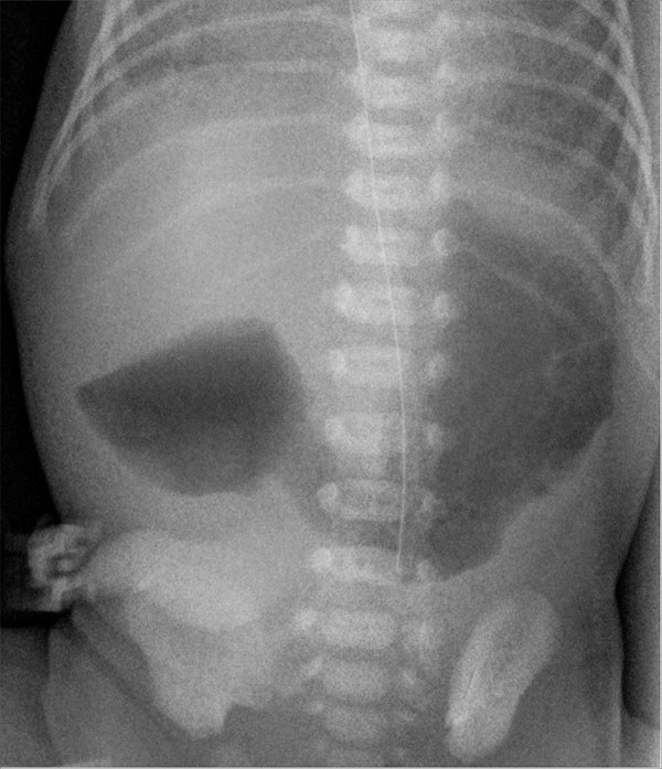 Abdominal X-ray imaging is crucial to the diagnosis of intestinal atresia. In duodenal atresia, the classic “double bubble” sign may be seen on abdominal X-ray in which both the stomach and first part of the duodenum are dilated. (See Figure 1.) In more distal cases of atresia, bowel distention also will be present. Other studies, such as upper gastrointestinal contrast studies, are less useful but may help rule out malrotation.46 Barium enemas may help differentiate between a large and small bowel obstruction in cases that are not clear.46 Additionally, during this workup, it is important to obtain basic laboratory work to assess for hypoglycemia, electrolyte abnormalities, and renal insufficiency.