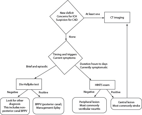 An overall algorithm for general vertigo is not well established; however, tests such as Dix-Hallpike and HINTS+ are useful tools in the ED to help differentiate causes of vertigo. As a general approach, identifying timing and differentiating central vs. peripheral causes is advantageous and can help narrow the differential. This is outlined in Figure 1.