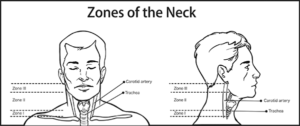 The neck was arbitrarily divided into three zones by Monson et al in 1969.2 This was further refined by Roon and Christenson in 1979.3 Traditionally, the evaluation of penetrating neck injuries was based on the zone of the location of the injury. The most caudal zone is zone I, and zone III is the most cephalad. (See Figure 1.) Zone I extends from the clavicles and sternum to the level of the cricoid cartilage. Major vessels within zone I include the proximal portion of the carotid arteries, the jugular-subclavian junctions, and the left innominate vein. Zone II is the largest zone and the most commonly injured. It extends from the superior aspect of the cricoid cartilage to the level of the angle of the mandible. Major vessels within zone II include the internal and external jugular veins, the common carotid arteries and their bifurcation into the internal and external carotid arteries, and the vertebral arteries. The trachea and esophagus are aerodigestive structures that extend through both zones I and II. Lastly, zone III extends from the angle of the mandible to the base of the skull. The vessels within zone III include the carotid and vertebral arteries and the internal jugular veins. Zone III also contains cranial nerve IX (glossopharyngeal), cranial nerve X (vagus), cranial nerve XI (accessory), and cranial nerve XII (hypoglossal).4 The contents located in each zone are summarized in Table 1.