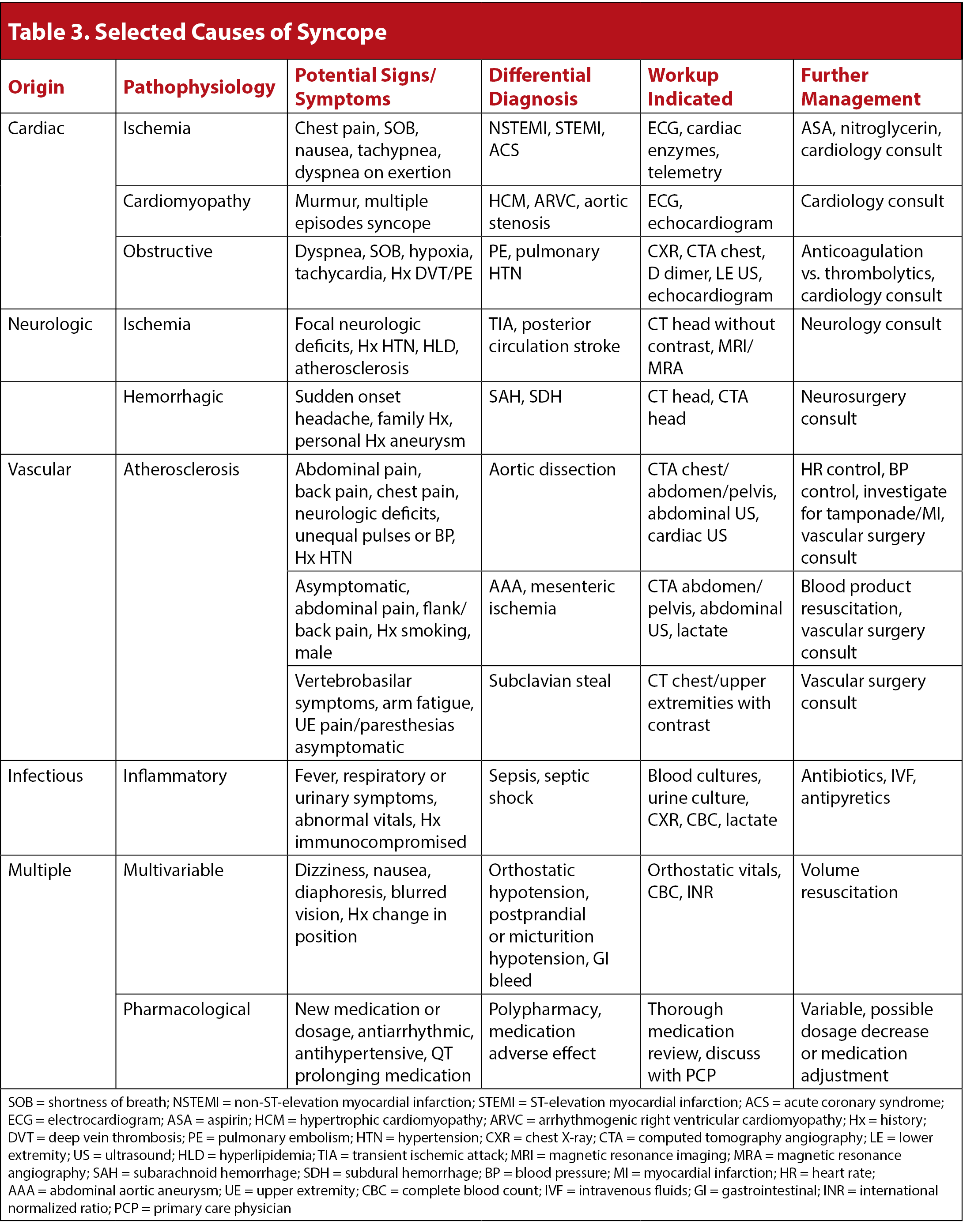 Older adults have an increased incidence of syncope starting at age 70 years.44 Consider syncope in unwitnessed falls, facial trauma, or falls in cognitively impaired patients who cannot accurately recall the events.44 The most clinically concerning causes of syncope are cardiogenic and neurologic, while the most common causes of syncope are orthostatic or postprandial hypotension, cardiogenic, vasovagal, and neurologic.44, 45 Cardiac causes of syncope have a high mortality rate, about 10% in six months, and underlying cardiac pathology increases this risk.44,45 (See Table 3.)