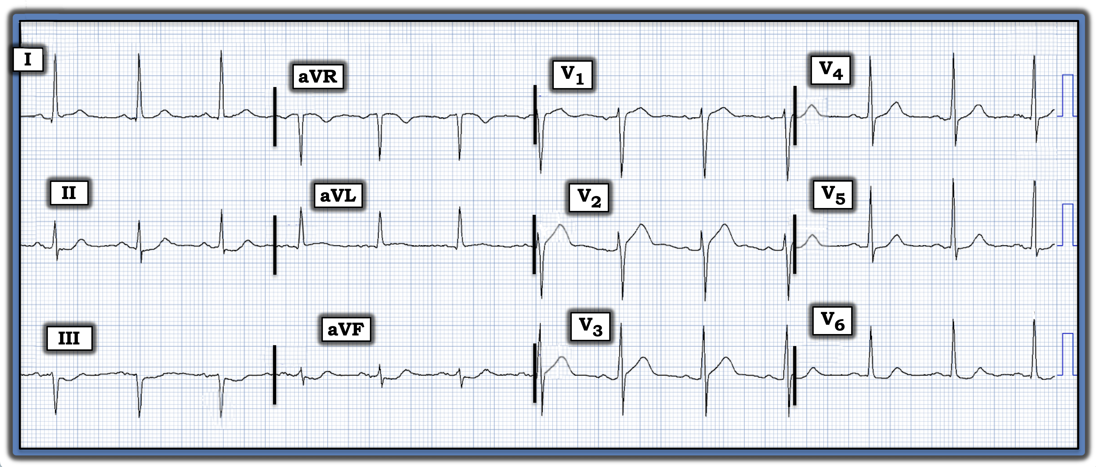 - Lastly, there is ST segment flattening with slight depression in lateral chest leads V5 and V6.