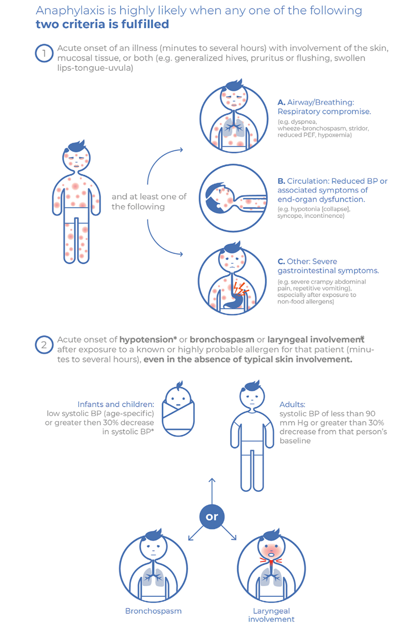 Worldwide, there have been many proposed criteria for anaphylaxis, and it has been challenging for experts to agree on a single best definition.1 A consensus is the diagnostic criteria of anaphylaxis proposed by National Institute of Allergy and Infectious Diseases and Food Allergy and Anaphylaxis Network (NIAID/FAAN), endorsed by the American Academy of Allergy, Asthma, and Immunology (AAAAI); American College of Allergy, Asthma, and Immunology (ACAAI); and the WAO.2,6,11 (See Table 2.)