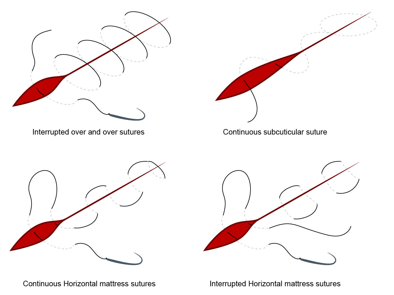 - Mattress sutures (horizontal, vertical) are good for high-tension wounds.