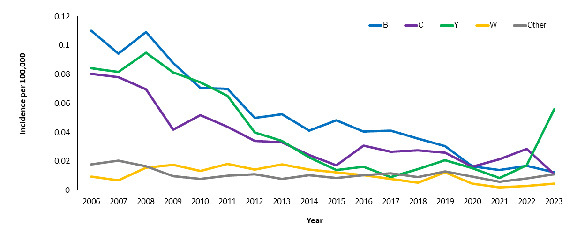 Figure 1. Trends in Meningococcal Disease Incidence by Serogroup — United States, 2006-2023* |