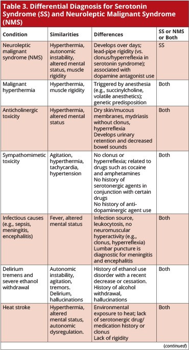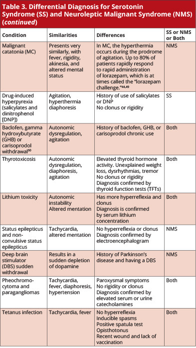 Table 3 summarizes most relevant conditions that should be considered in the differential diagnosis of both serotonin syndrome and neuroleptic malignant syndrome.