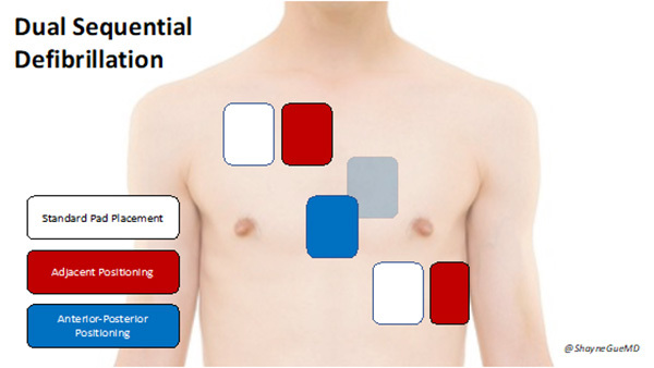 Placement of pads for DSD involves placement of the first set of pads in the traditional location on the right anterior chest wall along the sternal border and at the cardiac apex. For placement of the second set of pads, there are two location options that have been described. The first is to have each pad immediately adjacent to the first set, without touching. The second option is to have an anteroposterior positioning where one is placed on the center of the patient’s back and one in the center of the anterior chest. It is important to note damage can occur to the defibrillator if the pads are touching. (See Figure 8 for pad placement options.)