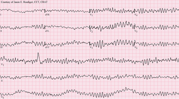 Ventricular fibrillation is the result of disorganized electrical activity, which produces similarly disorganized mechanical activity and, thus, ineffective contraction of the ventricles. There is no evidence of P waves or discernible QRS complexes on the ECG. If ventricular fibrillation is identified, return of spontaneous circulation is most successful following prompt defibrillation. CPR, with high-quality chest compressions, should be initiated and continued while preparing for defibrillation. CPR should continue for two minutes following defibrillation until subsequent rhythm check. See Figure 4 for an example of ventricular fibrillation on a 12-lead electrocardiogram.