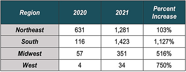 Figure 3. Drug Enforcement Administration Forensic Laboratory Identifications of Xylazine by Region |