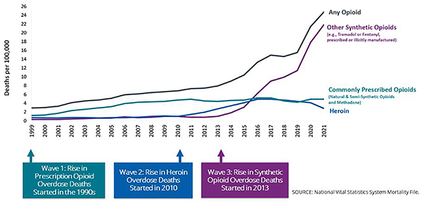 Deaths from the opioid epidemic can be categorized as occurring in three waves. (See Figure 1.) The first wave was due to the increase in legal opioid prescribing to treat chronic pain, encouraged by a regulatory emphasis on pain management. The second wave occurred when a significant number of patients who were prescribed opioids developed tolerance and then addiction, encountered difficulty legally obtaining their prescribed drugs, and turned to using heroin. The third wave was due to the influx of potent synthetic opioids, such as fentanyl, into the illegal market. Since 2016, more deaths have been reported from fentanyl overdoses than prescription opioids.15 In 2022, a reported 73,650 people died in the United States from fentanyl overdose.15
