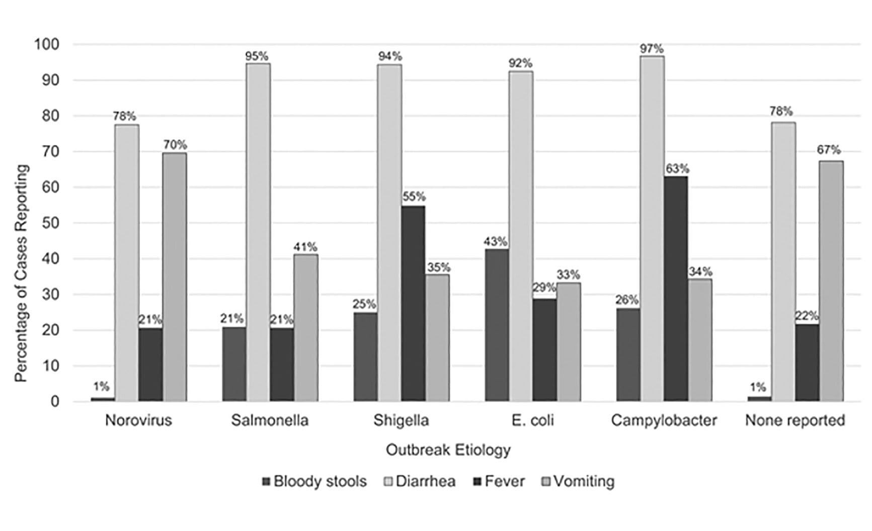 The most frequent symptoms associated with each etiology are depicted in Figure 1. One difference of note is the high frequency of vomiting in norovirus infection — not unexpected for an illness that has been called winter vomiting disease. Fever was more common with Shigella and Campylobacter infections, and bloody stools occurred in 20% to 30% of Salmonella, Shigella, and Campylobacter infections, while this was reported in 43% of E. coli infections.