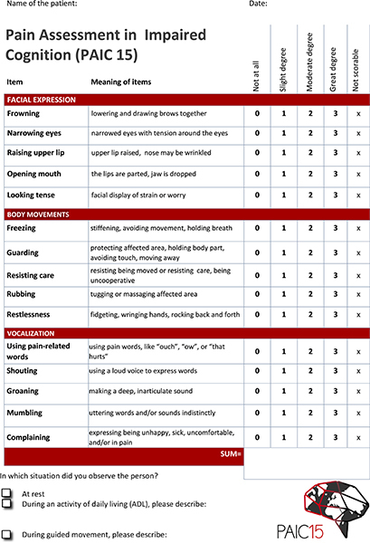 Source: Kunz M, de Waal MWM, Achterberg WP, et al. The Pain Assessment in Impaired Cognition scale (PAIC15): A multidisciplinary and international approach to develop and test a meta-tool for pain assessment in impaired cognition, especially dementia. Eur J Pain 2020;24:204. Creative Commons CC BY 4.0 DEED https://creativecommons.org/licenses/by/4.0/ |