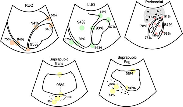 Based on a recent consensus statement, landmarks that should be included in the FAST exam are the bilateral supra/subdiaphragmatic spaces, hepatorenal recess, caudal edge of the liver, inferior/superior pole of the kidney; spleen, splenorenal recess, spleen tip; bladder, rectouterine/rectovesical space; hepatopericardial interface, anterior/posterior/periapical border, and right ventricle (RV) and left ventricle (LV).57 The “extended” portion of the exam includes lung views to evaluate for pneumothorax. It is important to consider that one of the limitations of any point-of-care ultrasound is operator-dependence. A recent retrospective cohort study showed none of the 200 FAST scans selected for review showed all 30 expected landmarks.58 (See Figure 1.)