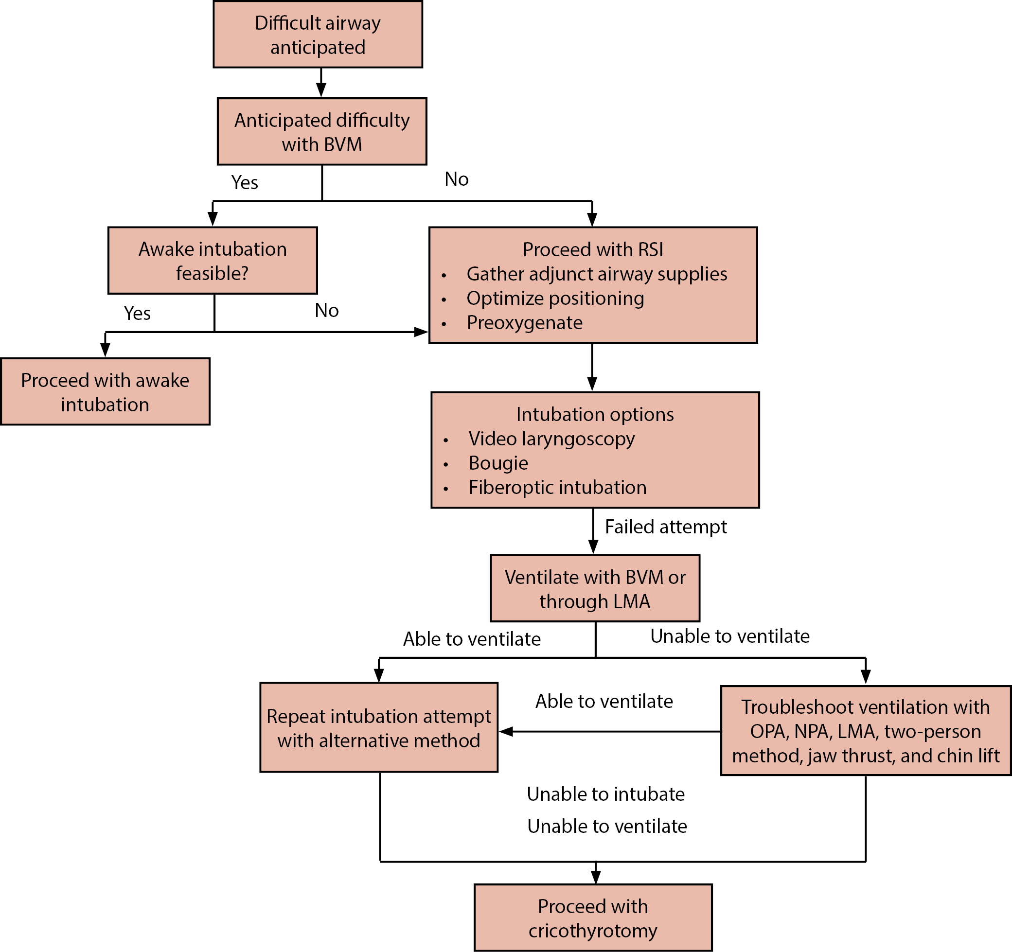 When a difficult airway is anticipated, always consider consulting with otolaryngology or anesthesiology to perform or have on standby. The next important question is whether bag-mask ventilation will be difficult. If bag-mask ventilation is anticipated to be difficult and an awake approach is feasible in a calm and cooperative child who will tolerate a longer intubation attempt, proceed with fiberoptic awake intubation. If bag-mask ventilation is not anticipated to be difficult or the patient is anticipated to be difficult to ventilate but is not suitable for an awake intubation attempt, proceed with RSI.