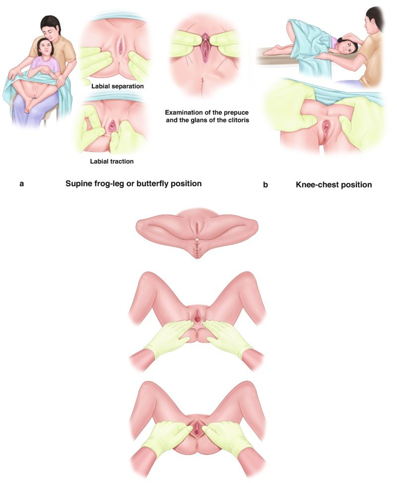 - To examine a straddle injury in a female, position the patient either supine with the hips abducted and knees flexed in a frog-leg position or prone in a knee-chest position to optimize exposure and facilitate thorough examination.
