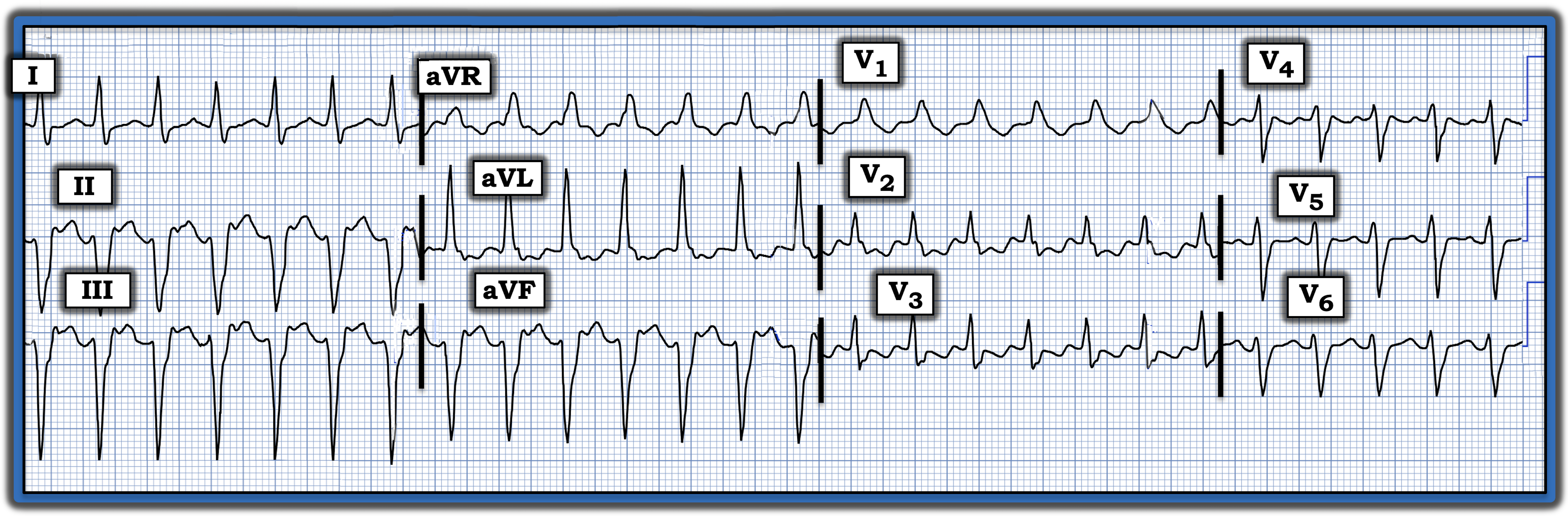 Interpretation: Although there is no long lead rhythm strip in today’s tracing, it is clear that there is a regular wide-complex tachycardia (WCT) at a rate of