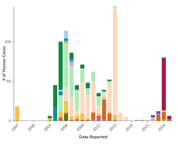 Centers for Disease Control and Prevention. Past reported global human cases with highly pathogenic avian influenza A (H5N1) (HPAI H5N1) by country, 1997-2025. Updated March 25, 2025. https://www.cdc.gov/bird-flu/php/avian-flu-summary/chart-epi-curve-ah5n1.html |