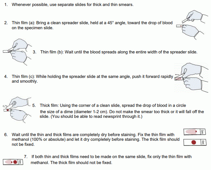 Source: Centers for Disease Control and Prevention. Laboratory diagnosis of malaria: Preparation of blood smears. https://www.cdc.gov/dpdx/resources/pdf/benchaids/malaria/malaria_procedures_benchaid.pdf |