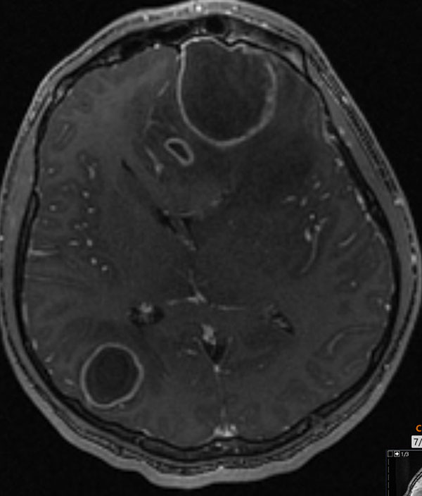 Brain magnetic resonance imaging post-contrast T1 depicting rim enhancement of abscesses Used with permission from Sean Kelleher, MD, Dayton Children’s Hospital. |