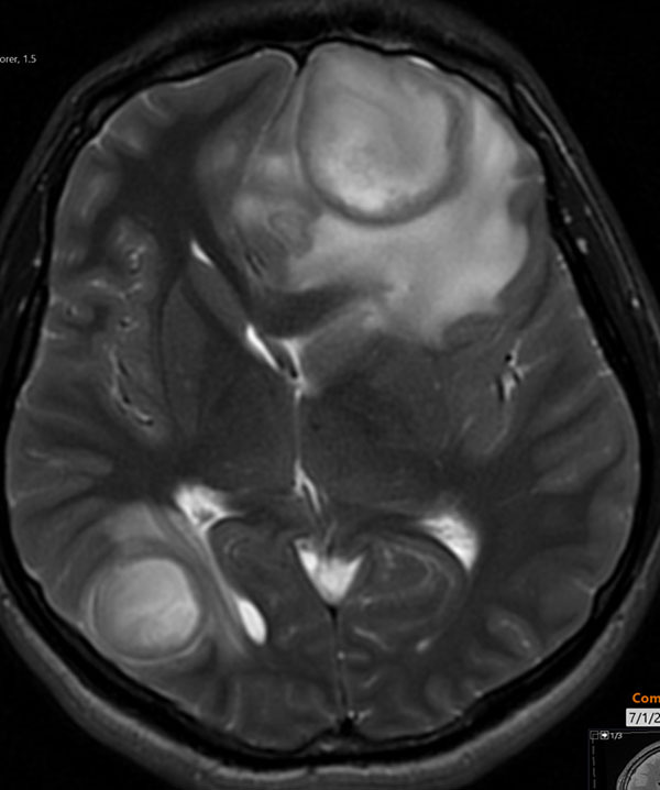 Brain magnetic resonance imaging T2 showing complex fluid within the lesion and extensive adjacent edemas Used with permission from Sean Kelleher, MD, Dayton Children’s Hospital. |