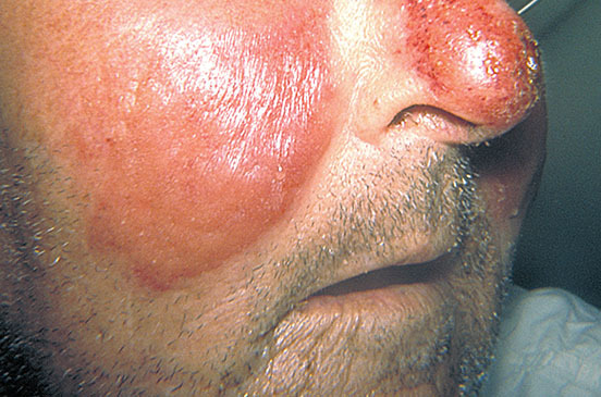 Erysipelas is an infection of the skin that is limited to just the dermis. It is characterized by an area of intense erythema that is raised from the surrounding skin. The infection has distinct borders. It typically spreads rapidly, and systemic symptoms such as fever or chills are common.17 Figure 4 shows the typical appearance of erysipelas. Note the intense edema of the skin. This contrasts with the typical flat nature of simple cellulitis. Diagnosis of erysipelas is clinical, and the preferred treatment is a penicillin. Clindamycin may be considered, but there is a higher rate of resistance compared to penicillins.17