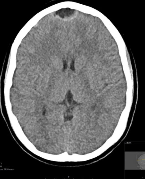 Axial contrast-enhanced computed tomography of a midline epidural abscess Used with permission from Mark Warren, DO, Dayton Children’s Hospital. |