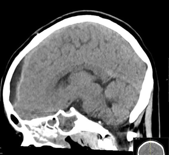 Sagittal contrast-enhanced computed tomography of a midline epidural abscess Used with permission from Mark Warren, DO, Dayton Children’s Hospital. |